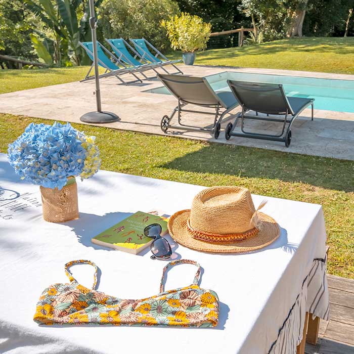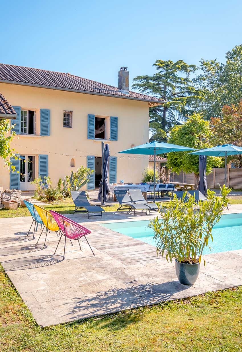 Une grande piscine, deux terrasses dont une cosy avec son brasero, une cuisine d’été.